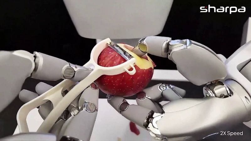 TL;DR: Sharpa Robotics demonstrated a humanoid robot autonomously peeling an apple using a new AI architecture called MoDE-VLA. The system combines dual-hand coordination with tactile sensing and a shared-autonomy training method called IMCopilot to collect manipulation data. In tests across four complex tasks, the approach doubled baseline performance and achieved a 30% success rate on the challenging apple-peeling benchmark.