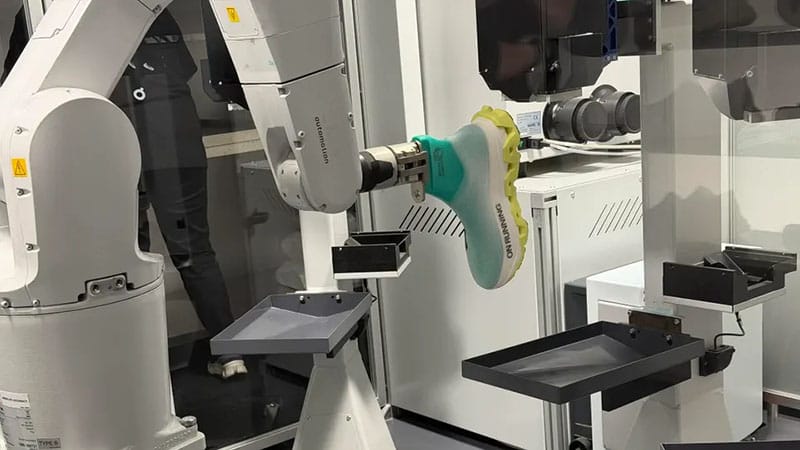 TL;DR: Swiss running brand On debuted its LightSpray shoe-making robot in central London ahead of the marathon. Inspired by a hot glue gun spiderweb video, the robot moves a shoe sole around a continuous filament stream, spraying a one-piece upper into place in about four minutes while producing lighter, laceless shoes with lower manufacturing emissions. Read more →
