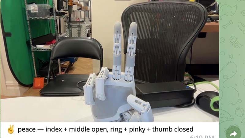 TL;DR: A developer connected Anthropic’s Claude to a 3D-printed Aero Hand Open from TetherIA, enabling the LLM to control all 16 joints through an ESP32-S3 board. Using a USB camera for visual feedback, Claude identified the device, accessed its serial port, verified firmware, and executed gestures like fist and peace sign while narrating actions in Telegram.