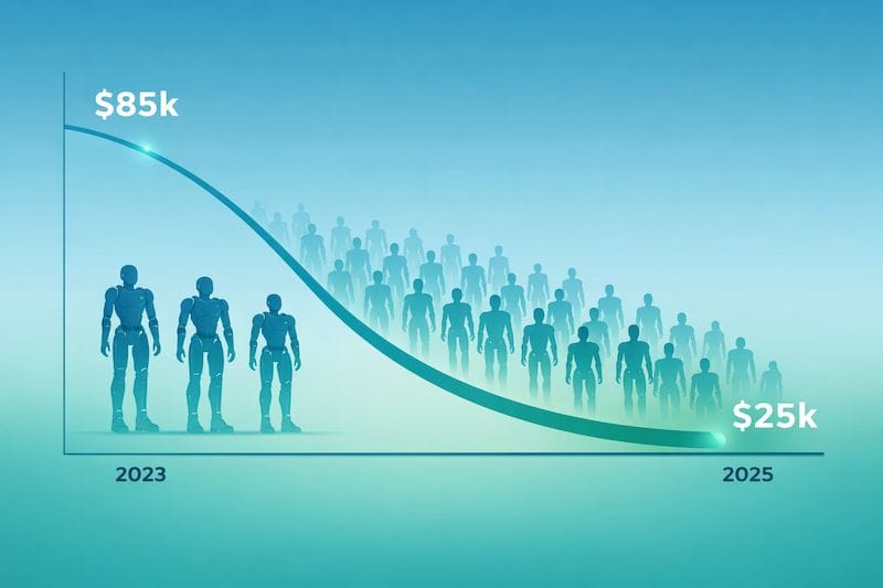 TL;DR: New data shows humanoid robot prices are falling rapidly, with Unitree Robotics reporting a drop from around $85,000 in 2023 to about $25,000 in 2025. Across the industry, prices now range from roughly $16,000 to $250,000 as companies move from prototypes into early production, standardizing components and scaling manufacturing.